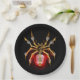 Aranha mecânica, com pá-pá de ouro, engrenagens de latão e uma lâmpada de vidro vermelha sobre fundo preto. Estilo Steampunk.