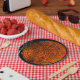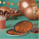 Chapas de papel de Halloween com fundo malhado cor de laranja e bordas laranja com teias de aranha e aranhas.