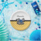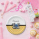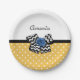 Adicione uma vibração girada ao estilo da sua festa com estas placas de papel de padrão de bolinhas brancas e amarelas bonitas com um arco chevron preto e branco de tendência e um rosa de fita azul-chic. Faça com que esse retrato amarelo e azul encontre a design moderna personalizada adicionando o nome da adolescente da hora. Imagem impressa plana, NÃO fita e arco de rosetas reais.