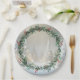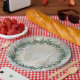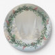 Árvores de Natal embelezadas com neve branca e uma coroa festiva vermelha e verde circular.
