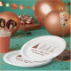 O design de prato de festa de papel festivo sazonal apresenta uma exibição sofisticada de árvores de Natal nevadas em vermelho, dourado e rosa em um fundo bege creme neutro levemente listrado e coberto de neve. A seção inferior é coberta de neve branca com "Feliz Natal" em tipografia clássica elegante. Adicione um nome personalizado ou linha de texto personalizado em letra cursiva vermelha correspondente com o modelo fácil de usar. Por favor, envie mensagem ou e-mail para beachpausedesigns@gmail.com para personalizações adicionais.