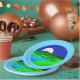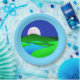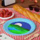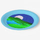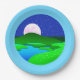 Chapas de papel em ilustração circular de uma ascensão de lua de cheio sobre colinas verdes por uma margem do lago, com um céu azul estrelado à meia-noite