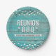 Esta reunião de família anual do design verde azul-rústico CHURRASCO apresenta um fundo de madeira com luzes de cordas e gráficos de grelhas. Este design de prato é perfeito para reuniões de família em festas de churrasco. Aproveite seu churrasco!