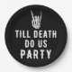 Pratos de papel Até que a morte nos separe em preto com uma mão de esqueleto e letras brancas. Decorações de mesa de festa assustadoras para um chá de panela, despedida de solteira, festa de casamento ou qualquer festa temática. Certifique-se de visitar nossa coleção para ver mais itens coordenados que combinam com este design para o seu evento especial.