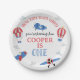 Blue How Time Flies Plane Paper Plate Blue, vermelho com um toque de amarelo como o tempo voa primeiro prato de papel de aniversário para um menino apresentando alguns aviões, balões de ar quente e nuvens.
