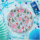 Natal bonito - natal abstrato retrorreflector colorido - padrão de feriado azul claro com arcos / fitas, árvores de natal, bolas, flocos de neve, meias de natal e estrelas.