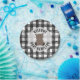 Uma placa de chá de fraldas com ilustração de um urso bebê sobre um fundo de gingham preto e branco. O urso está vestindo uma coroa de flores.