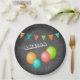 Placas De Papel De Aniversário Para Bandeja De Balão De Balão De Calcão De Bico. Belas pratos de festas de aniversário para a celebração da festa de aniversário do garoto. Balões coloridos e bandeiras de bunting no quadro de cinzas. Personalize com o nome do seu filho.