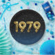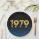 Balões de folha de ouro para o ano de nascimento de 1979 sobre fundo preto e azul gradiente com estrelas noturnas para festa de aniversário.