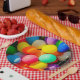 Um aglomerado de balões brilhantes e coloridos de brinquedos contra o fundo da floresta escura. Fotografia texturizada.
