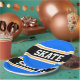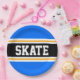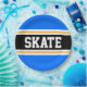 Este esportivo, design atlético, apresenta SKATE de texto ousado dentro a uma faixa preta destacada com faixas duplas de corrida branca e amarela contra faixas externas azuis brilhantes. O texto pode ser personalizado.