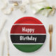 Um padrão horizontal vermelho e verde riscado e o texto: Feliz Aniversário.