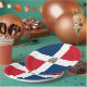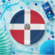 Esta design apresenta a bandeira da República Dominicana (em espanhol, República Dominicana), que é um país localizado na ilha de Hispaniola, no arquipélago das Grandes Antilhas da região do Caribe. A República Dominicana ocupa os cinco oitavos orientais da ilha, que partilha com o Haiti. O idioma oficial do país é o espanhol. A capital e maior cidade da República Dominicana é Santo Domingo. A bandeira da República Dominicana é vermelha, branca e azul: o azul significa liberdade, o branco para salvação e o vermelho para o sangue dos heróis. No centro da bandeira está o casaco de armas da República Dominicana, que inclui o lema "Dios, Patria, Libertad" ("Deus, Pátria, Liberdade").