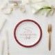 Alojando o dia do peru com os seus amigos? Sirva as boas-vindas de Ação de Graças nessas pratos festivas de papel "Ação de Amizade" em tons de outono de granada e abóbora. Design apresenta uma borda vermelha escura com seus nomes, o ano e o "banquete de Amizade" em blocos de tendências e tipografia de scripts com uma ilustração de bolota.