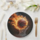 Uma bola de basquete embutida em chamas é captada pelo ar-médio enquanto se aproxima do aro, enfatizando o movimento dinâmico e a intensidade