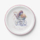 Placas de papel de chá de fraldas, com gráficos de um bonito bebê buggy com flores e arcos e uma jante rosa, ao redor da borda. Personalize o texto personalizado cor-de-rosa para atender às suas necessidades.