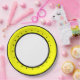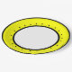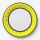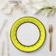 Borda amarela brilhante com bolinhas negras geométricas. Círculo preto com fundo central branco. Divertido para o verão. Design por TamiraZDescarnece.
