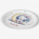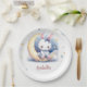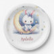 Placa de papel super fofa com um belo coelhinho branco vestindo um belo arco roxo sentado em uma lua amarela com algumas estrelas douradas caindo.