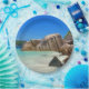 Placas de papel com uma fotografia de uma praia azul-turquesa de oceano com rochas grandes espalhadas ao longo da costa. Local tropical brilhante e ensolarado.