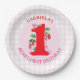 Este design de aniversário de morango apresenta um gigante vermelho número um rodeado por morango de cor d'água e floresce em rosa e vermelho com folhas verdes sobre um círculo rosa contra um fundo de xadrez rosa. Você pode modificar o nome e o evento. Veja toda a coleção correspondente. Toda a trabalho de arte é ilustrada e protegida por direitos autorais por Kaitlyn Thomas.