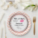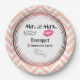 Placas de papel personalizadas para um aniversário de casamento com um design de tendências - lábios de kissy cor-de-rosa glamourosos e uma ilustração de bigode retrógrada masculina. Palavras retrógradas dizem que Sr. e Sra. e você pode personalizar com seu nome e anos juntos. Colocado sobre um fundo de cromo de pêssego.