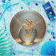 Um peixe-dourado vestindo uma festa que salta de um aquário, criando uma rampa e espalhando gotículas de água no ar para uma festa de aniversário.