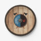 Um escudo Viking e eixos de batalha cruzados sobrepostos a uma imagem de fundo de uma prancha de madeira. O escudo é preto no lado esquerdo com um impressão vermelho direito. O outro lado da blindagem é azul com uma águia branca no estilo Celtic-Norse. Personalize adicionando seu próprio texto. Você também pode alterar as cores dos anéis de borda ou removê-los. Os escudos viking variaram. Baseei-me em exemplos históricos. Os escudos às vezes estavam cobertos de couro, assim como este. Como resultado, a tinta é imperfeita, o que permite ver uma sugestão do couro subjacente. As bordas de ferro eram raras; optei pela cobertura de couro, como era frequentemente utilizado. Eu optei por cabeças de machado simples em vez do machado de barba e interpretações mais fantasiosas que são comumente empregadas por artistas.