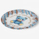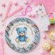 Blue and brown yarn crocheted teddy bear. it's a boy baby shower paper plates. Adorable trendy theme for a sweet boy's baby shower.