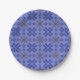 Two images showcase a round plate with a blue geometric and floral pattern. The first image displays the plate from the top, and the second shows it angled.