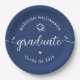 Be proud, rejoice and showcase this milestone of your favorite grad! Celebrate with these simple, modern, bold custom paper plates. Fun white handwritten calligraphy script with cute, playful hearts and a graduation cap icon overlay a navy blue background. Personalize the custom text with your graduate’s name and class year or special message. Available in 2 sizes: 7” or 9”, round or square. Matching invites, thank you cards, hand fans, banners, yard signs and other graduation goodies are also available in this trendy and playful collection. Guaranteed to add stylish fun to their special party!