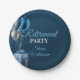 A stylish blue balloon and gift party paper plate for a retirement party, farewell party celebration. Features blue and silver balloons with blue and white text.