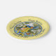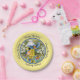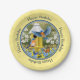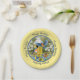 Um par de pássaros azuis orientais fazem sua casa em uma linda casa de pássaros amarelos dentro de um belo jardim de primavera cheio de margaridas azuis e amarelas e cercados por madeira de pau florida. Borboletas laranja e azuis também visitam as flores. Acentuado com um plano de fundo amarelo ensolarado e padronizado.