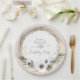 "Blush BOHO Anemone Floral Wreath Festa de aniversário Plate." Pintada elegantemente com aquarelas, coroa floral com flores brancas de anêmona, folhagem de folhas de eucalipto, folhas de oliveira, salgueiro de rata e galhos foram criados por uma artista e designer internacionalmente licenciada, Audrey Jeanne Roberts, autora.