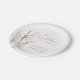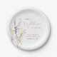 Elegant baby girl shower paper plates featuring "a little wildflower is on her way" showcased in a blend of light grey typography and a whimsical pink script, and a boho-inspired watercolor bouquet of purple, pink and yellow wildflowers.