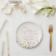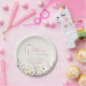 Elegant light cream baby girl shower paper plates with "a little wildflower is on her way" showcased in a blend of grey typography and a stylish pink script, and boho-inspired whimsical watercolors of dainty purple, pink and yellow wildflowers. Add the name of the mother-to-be in simple pink lettering.