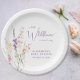 Elegant baby girl shower paper plates featuring "a little wildflower is on her way" showcased in a blend of light grey typography and a whimsical lavender purple script, and a boho-inspired watercolor bouquet of purple, pink and yellow wildflowers.