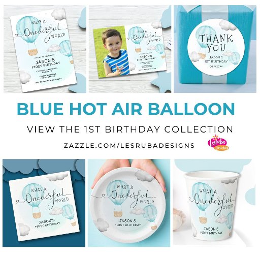 Boys de Ar Quente Primeiro Aniversário Placas de Papel com Balões de Ar Quente de Cor Azul e Nuvens Flutuantes. Wanderlust e A festa de primeiro aniversario do mundo para rapazes.