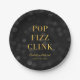 Pratos de papel elegantes com as palavras "Pop Fizz Clink" em folha de ouro falso sobre um fundo com padrão de luzes bokeh cinza escuro. Perfeito para festas de noivado, casamentos, aniversários ou vários outros eventos.