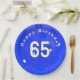 Fechamento de uma bola de piclebol azul neon para um aniversário de 65 anos. Todo o texto pode ser alterado ou excluído.