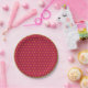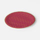 Belo prato de papel com bolinhas de ouro elegantes, enquadradas com um círculo de ouro sobre fundo vermelho de burlagem. Ideal para todas as comemorações.