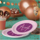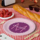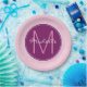 Personalize com um primeiro monograma e um nome num círculo roxo rico. O fundo é cor-de-rosa com pequenas bolinhas brancas giras.