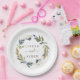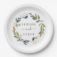 Esses pratos de papel para bolo de casamento com folhagem de outono são perfeitos para um casamento de outono. O design moderno e rústico apresenta folhas em azul naval, verde sage e dourado com ramalhetes de flores azul-escuras. Esses pratos de papel descartáveis são perfeitos para a mesa de bolo ou sobremesa. Personalize-os com os nomes dos noivos.