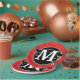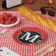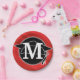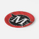 Placa de papel vermelho, preto e branco do boné de formatura monograma.