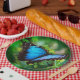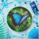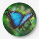 Uma fotografia surpreendente de uma borboleta azul de Morpho (peleides de Morpho) empoleirou-se em algumas folhas.