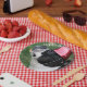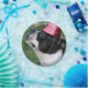 Um terrier de Boston com um chapéu vermelho do partido sobre.