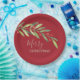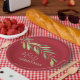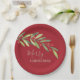 Paper plates in 2 sizes feature elegant greenery and berries with your message in chic lettering in any color (we show gold) and on any color background (we show red.) MATCHING items in our store.