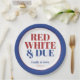 Tema moderno e minimalista do chá de fraldas "Vermelho, Branco e Devido" com cores patrióticas americanas de 4 de julho com tipografia ousada.