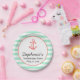 Mint listras verdes com placa de festa de aniversário náutica de âncora cor-de-rosa-coral. O design apresenta um padrão listrado verde e branco da casa da moeda, um círculo branco com uma âncora cor-de-rosa coral e o seu texto personalizado.