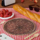Um fractal rotacional em tons de terra com linhas de looping de cor clara sobre um fundo castanho de chocolate médio e escuro. Adicione seu próprio texto.