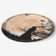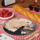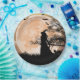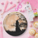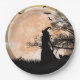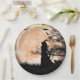 Mágica para o Dia das Bruxas. Um pano de fundo com um azul roxo colorido, nublado, céu noturno com estrelas e uma lua de cheio laranja que tem os silhuetas de uma bruxa, um gato, morcegos e uma árvore adormecida.